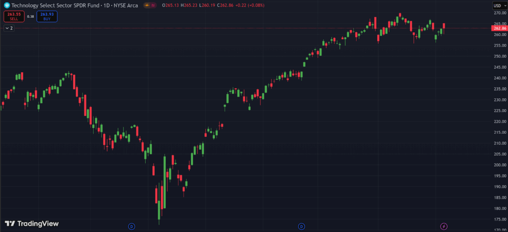 Even as the popular tech sector – represented by Technology Select Sector SPDR Fund (XLK) below – has continued to grind lower for the past few weeks.