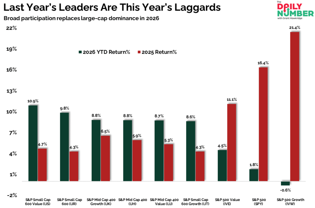 One needs to only look at the vast gulf between the green and red bars for each index to see how much the market has rotated.