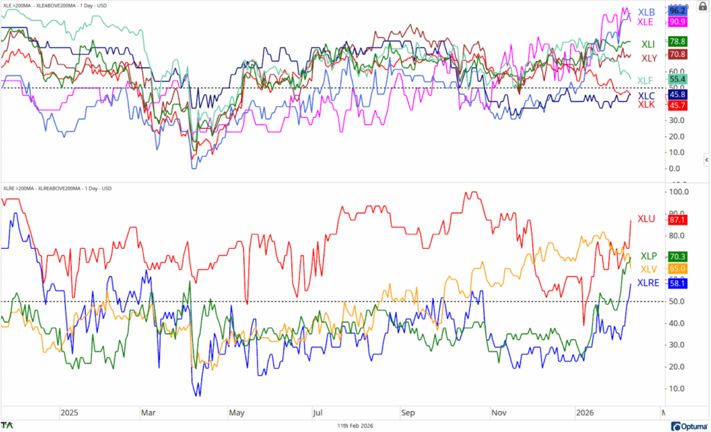 It shows the percentage of each S&P sector trading above their 200-day moving average – a gauge of long-term direction.