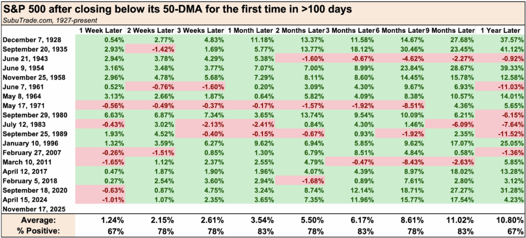 This chart shows how the S&P 500 has performed across various timeframes ranging from a week to 12 months after a 100-day streak above its 50-day moving average has ended.