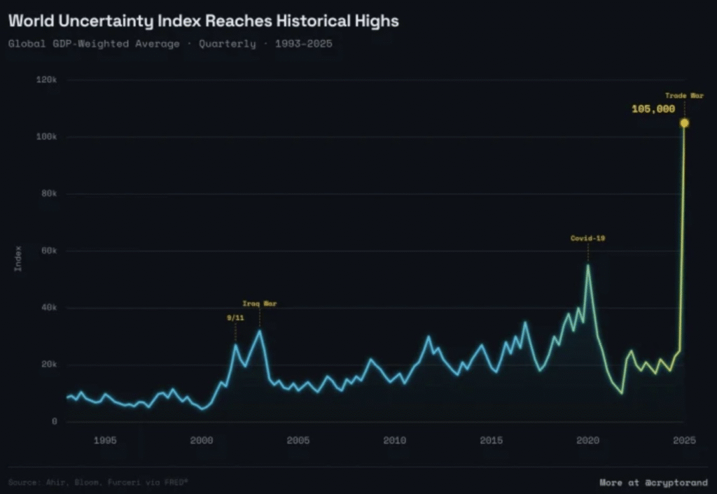 It measures how often economic and political uncertainty is being discussed across major countries around the globe – essentially a gauge of how nervous the world feels.