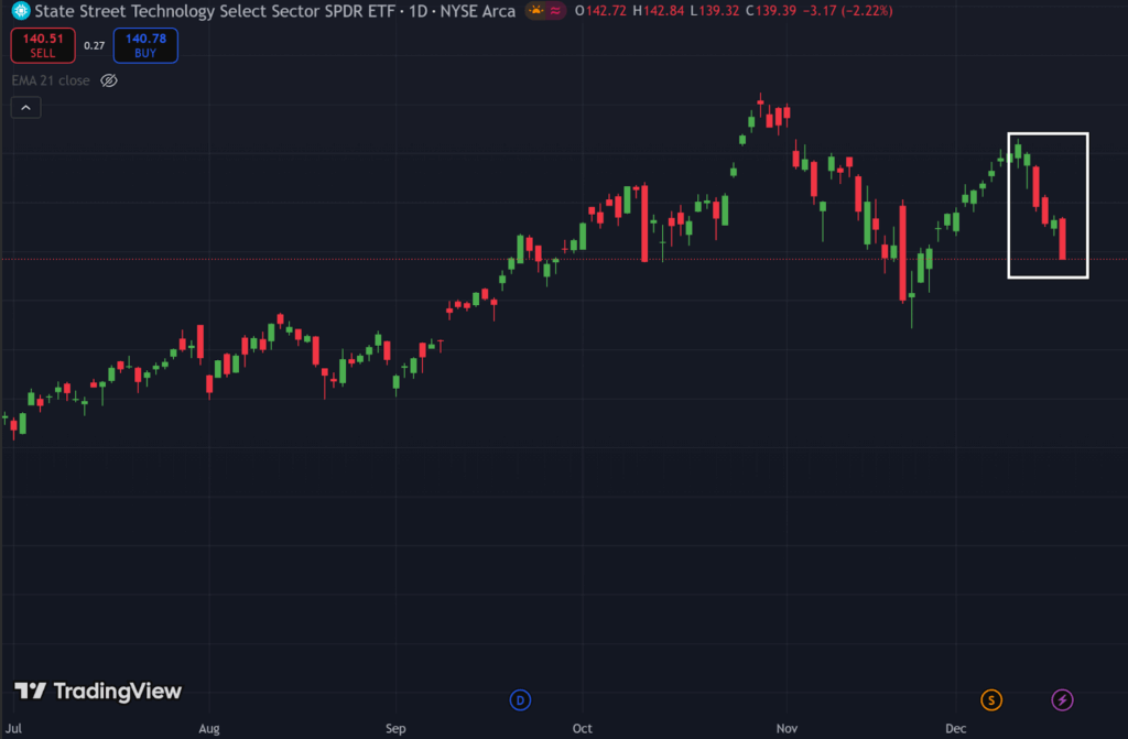 Case in point, the tech sector ETF – XLK – has dipped in the past five consecutive trading sessions.