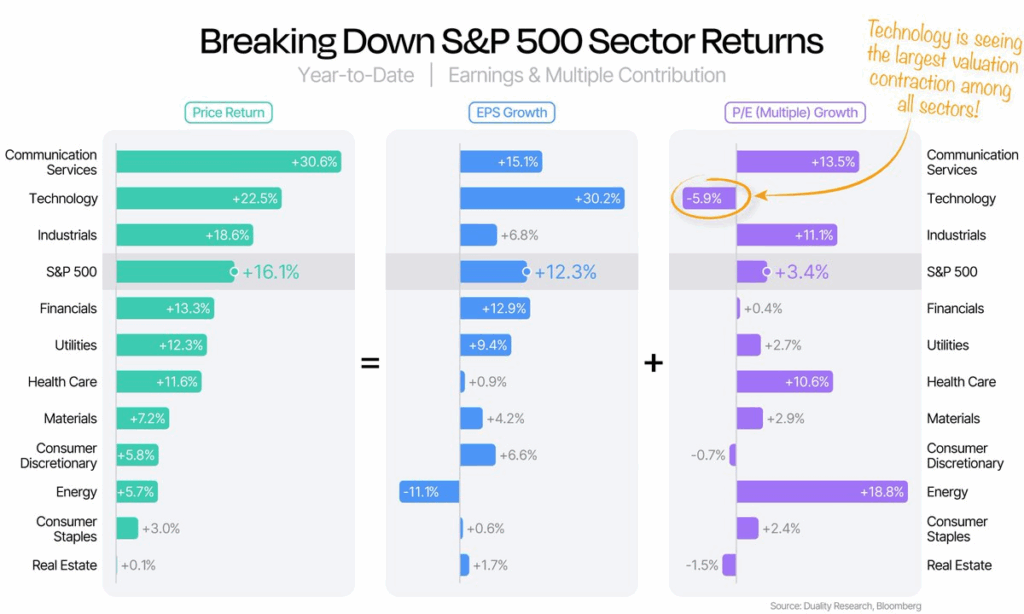 The tech sector is displaying positive divergence – with multiples contracting but earnings growing