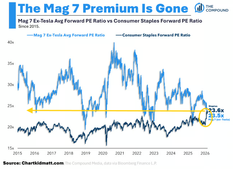 It shows the forward P/E ratio of the Magnificent 7 (sans Tesla) versus the Consumer Staples sector.