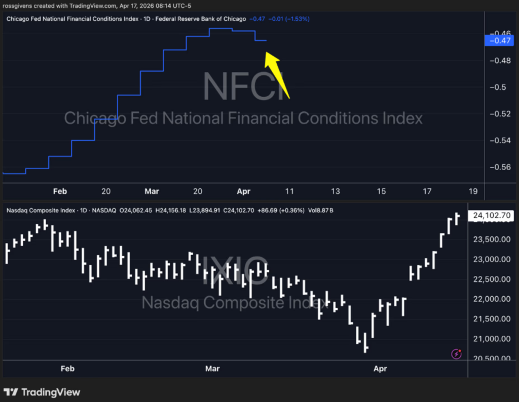 The National Financial Conditions Index, which is my preferred indicator for market liquidity, shows conditions loosening once again.