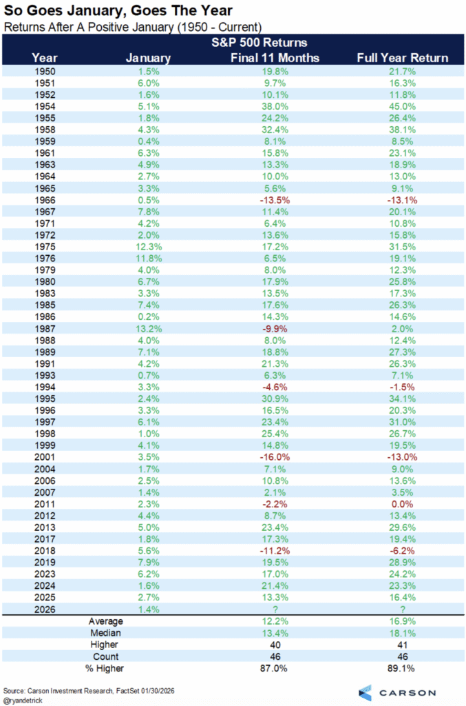 With the data showing that every time the S&P 500 closed higher in January, it closed higher for the year almost 90% of the time.